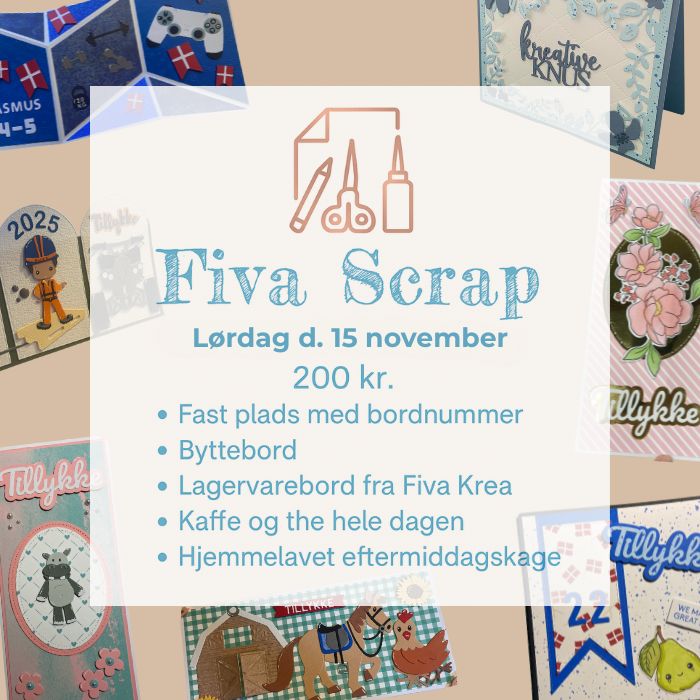 Kom med til en kreativ og inspirerende dag hos Fiva Scrap! Tag plads ved dit eget bord og glæd dig til en dag fyldt med scrapbooking, hygge og masser af skønne muligheder.