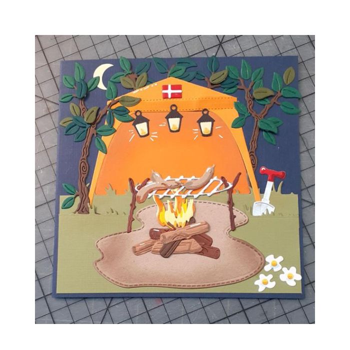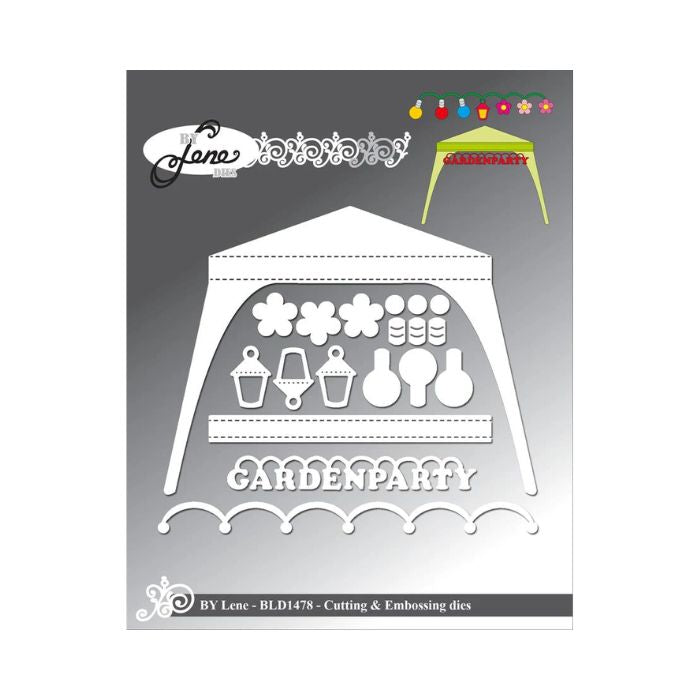 By Lene cutting die med en havepavillon og en masse pynt og lamper som motiv.